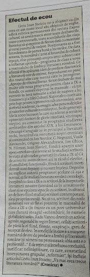 Apropo de viitorul literar. Se tot dezbate de mai multe zilele noua programa pentru clasa a IX-a liceală, cu autorii cuprinși în manuale – că tot suntem în luna ianuarie a zilei nașterii lui Eminescu și a Zilei Culturii Naționale („instituită prin lege pentru a promova cultura română, arta și efortul academic, ca omagiu adus personalităților și valorilor culturale românești”). Noile generații (de la 2000 încoace; la care au aderat și scriitori optzeciști doritori de glorie imediată, „în timpul vieții”), au contestat în programă studierea scriitorilor din secolul XIX, a lui Eminescu-Creangă-Caragiale (și în principal a literaturii vechi, începând cu minunații noștri „cronicari” și continuând cu Ion Neculce, C. Negruzzi, Vasile Alecsandri, Grigore Alexandrescu, Ion Ghica, N. Filimon, Ioan Slavici), fiindcă aparțin unor epoci „revolute” și e nevoie să fie studiații scriitorii în viață ai ultimelor generații în clasa a IX-a! Că de aceea nu avem cititori azi în rândul elevilor, ci „analfabeți funcționali”, fiindcă scriitorii morți demult sunt depășiți și nu sunt înțeleși.